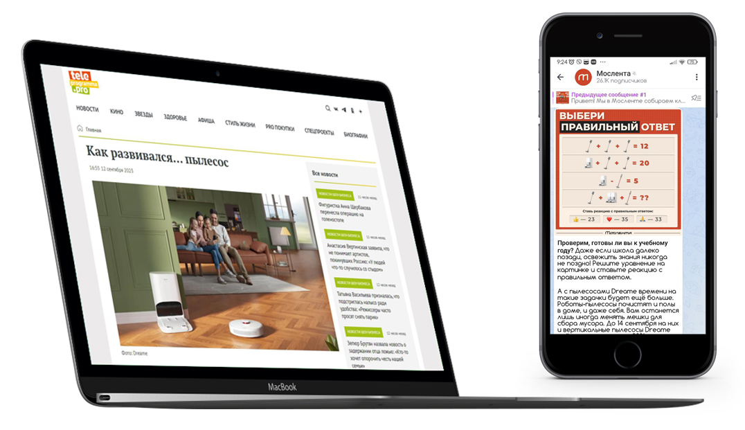 Для СМИ мы выбрали формат полезных информационных статей, для Telegram — вовлекающие геймифицированные посты. В актуальные для целевой аудитории материалы мы аккуратно встраивали информацию о пылесосах Dreame.