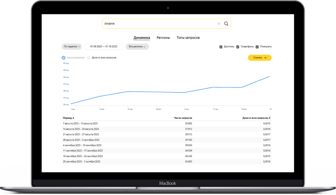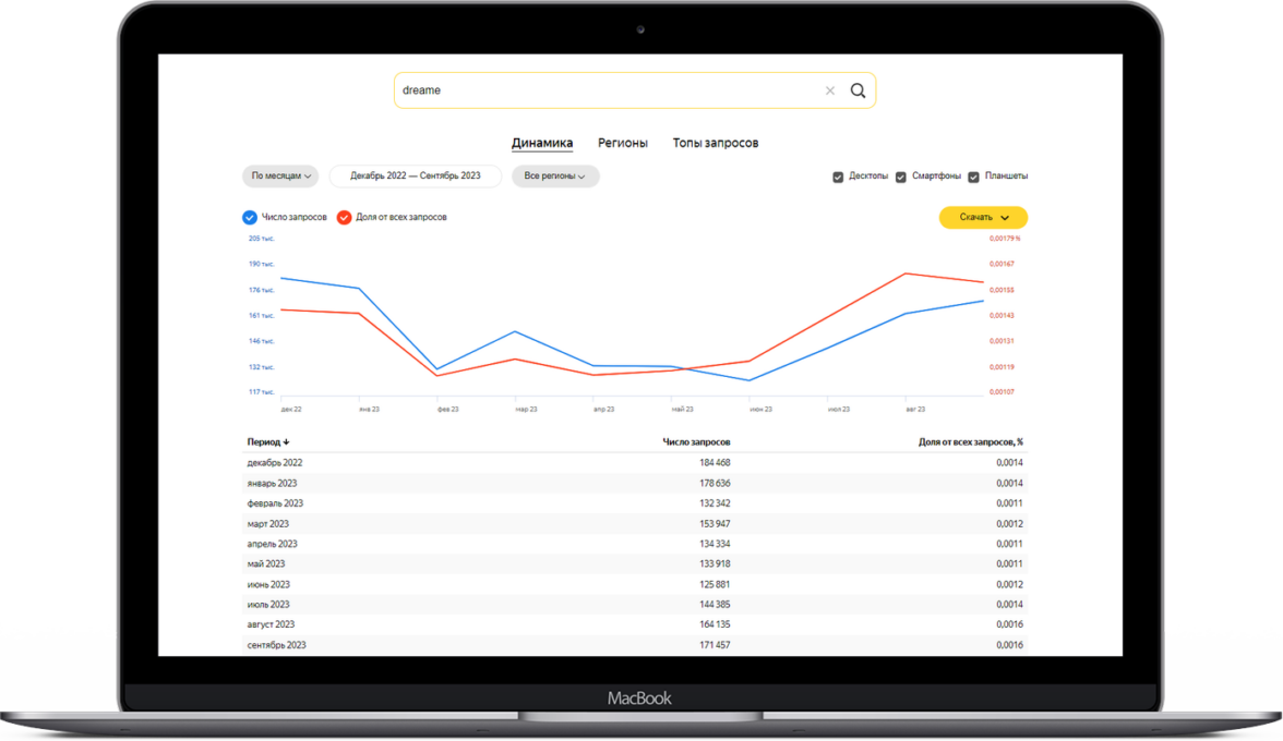 При этом, если посмотреть статистику по месяцам, можно увидеть, что популярность запросов на Dreame в сентябре лишь немного уступает спросу в декабре — в самый жаркий, предновогодний сезон. А доля в числе всех прочих запросов Яндекса даже выше.
