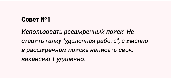 Часто эйчары и работодатели не замечают галку «удаленная работа» в интерфейсе хх, когда пишут вакансию. Поэтому, они пишут слова «удаленная работа» прямо внутри текста. Чтобы найти такие вакансии, нужен расширенный поиск. Если в нем вбить «маркетолог удаленно», хх не ставит галку поиска по «удаленной работе», а ищет именно то, что вбил в поиске. Вакансий становится в разы больше.