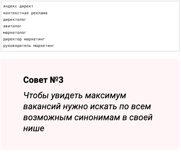 Вакансия маркетолога может называться по-разному. Я даже знаю анекдотичный кейс, как компания не могла 3 месяца найти маркетолога, потому что назвала вакансию «менеджер по маркетингу» и не получала просмотров. Обычно для поиска себе вакансий я использую ключи: