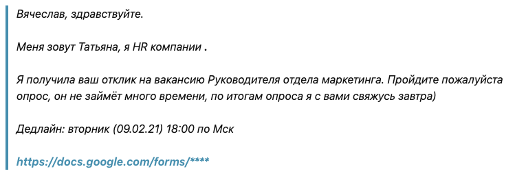 Для кандидата на маркетолога классно, когда на связь выходит не эйчар, а сразу владелец или РОП. Это сокращает собес, вы сразу переходите к насущным вопросам. А еще это значит, что начальника-маркетолога в этой компании нет. Много приглашений содержат анкету: