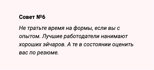 Я заваливал собесы с эйчаром на вопросе «готовы ли вы работать по времени Владивостока, так как работодатель во Владивостоке?». Понятно, что не готов, но обсуждать это нужно не с эйчаром. А для эйчара я становлюсь просто неудобным кандидатом. Меня отсеивают, и я не получаю возможности договориться с ЛПРом. А тот все еще может оказаться договороспособным.