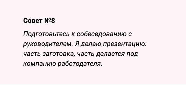 Научился конверсии 50% на собесе с руководителем за счет презентаций. А потом и без презентаций — у меня в голове уже был план, о чем поговорить.