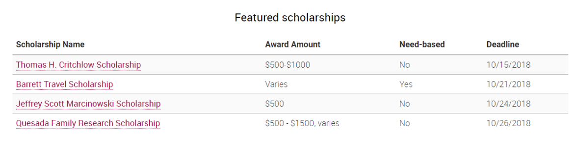 Страница стипендий с сайта Университета Аризоны