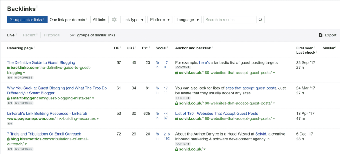 Это можно сделать с помощью сервиса Ahrefs в отчете Backlinks. Результаты экспортируются в файл.