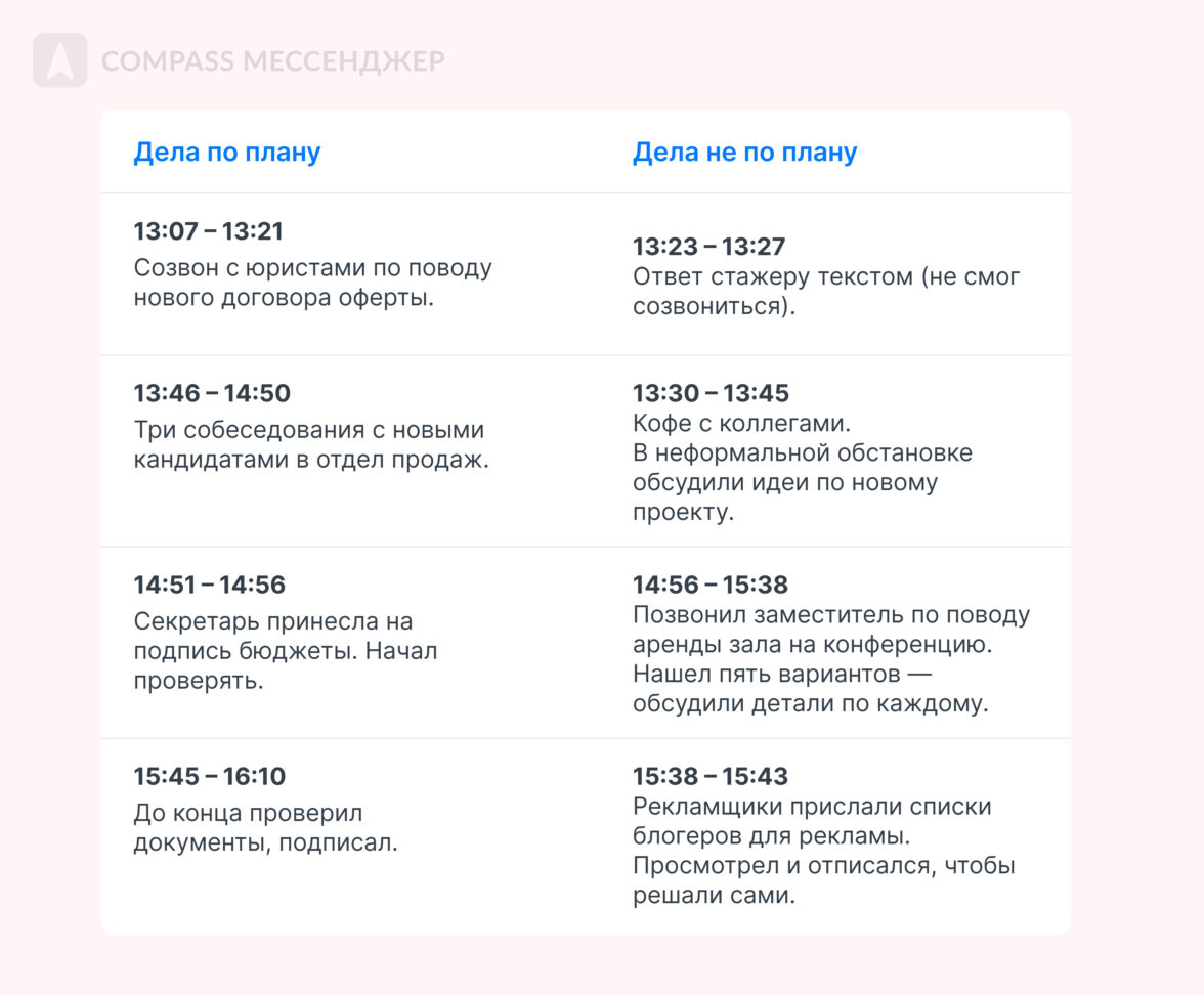 Первое, с чего стоит начать — понять, на что действительно уходит ваше время. Для этого в течение нескольких дней фиксируйте все действия, даже самые мелкие. От плановых встреч и отчетов до спонтанных переписок в мессенджерах и коротких звонков.