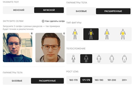 В сервис нужно загрузить селфи и выбрать один из режимов настроек фигуры. Базовый создает генерации по телосложению: от худощавого до полного. В расширенном — можно также указать тип фигуры и рост, чтобы точнее «подогнать» форму.