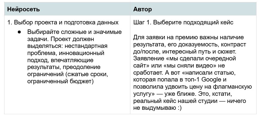Давайте на примере. Я попросила нейросеть написать статью об упаковке бизнес-кейса для премии. У нас в студии уже есть аналогичная статья — интересно сравнить тексты как раз с точки зрения авторского голоса и экспертности.