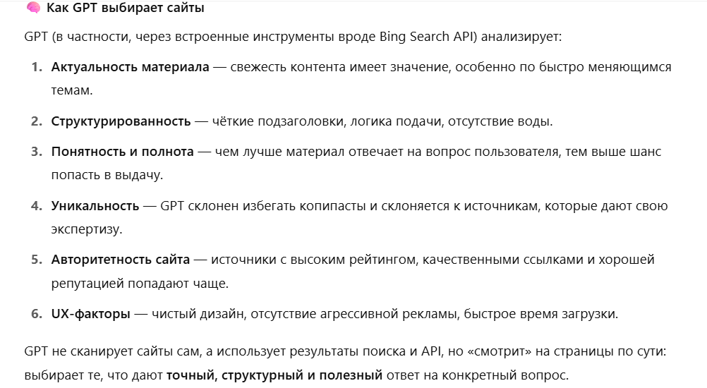 Задача бренда — не просто попасть в топ, а стать источником, которому доверяет ИИ, из которого он берёт ответы. Конечно, я не могла не спросить сами нейросети о факторах выбора доверенных ресурсов. Вот ответ ChatGPT: