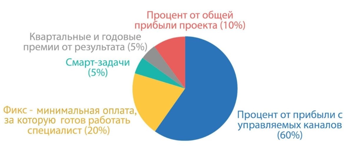 Например, может быть такая мотивация: M = 5% * (прибыль с канала) + 20 000. Специалист получает фиксированную часть в 20 000 рублей и 5% от прибыли с канала.