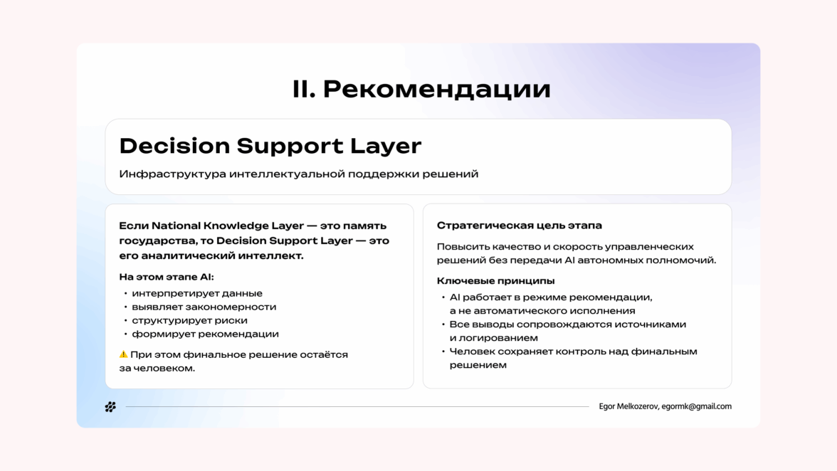 Когда единый слой знаний уже собран, можно переходить ко второму этапу — Decision Support Layer. Здесь AI уже работает как интеллектуальный помощник для анализа и поддержки решений. Он помогает интерпретировать данные, видеть закономерности, находить риски и быстрее готовить выводы, но не забирает у человека право финального решения.