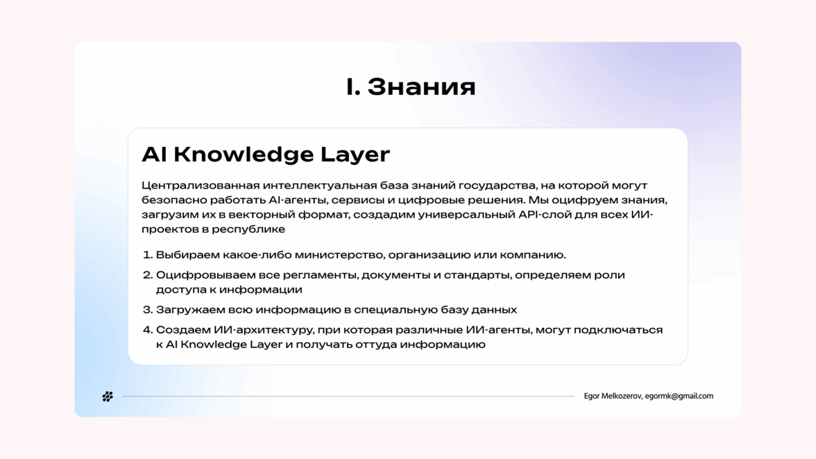 Я бы начинал с создания AI Knowledge Layer — единого слоя знаний, на который потом сможет опираться вся AI-инфраструктура республики. На этом этапе мы оцифровываем регламенты, документы и стандарты, определяем роли доступа, загружаем всю информацию в специальную базу и строим RAG-слой как универсальный API-контур. Дальше к нему уже могут подключаться разные AI-агенты и сервисы.