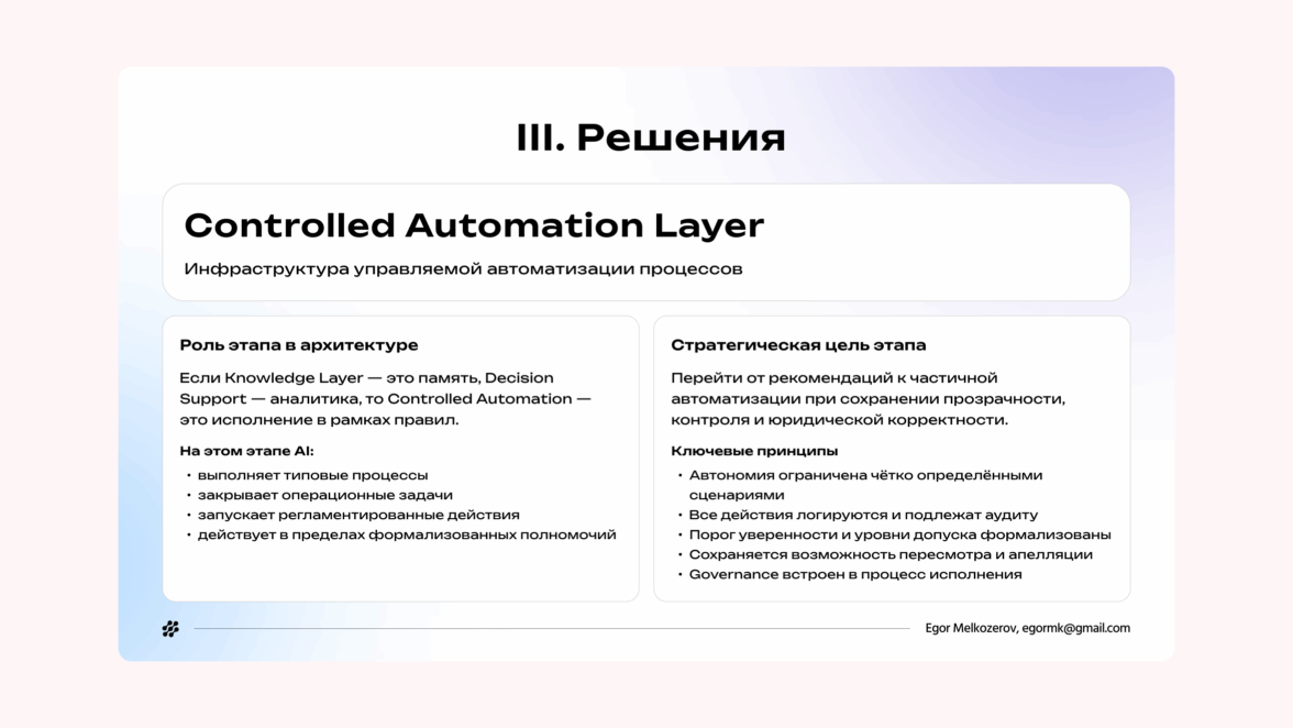 Следующий этап — Controlled Automation Layer. Если на первом этапе AI работает как слой знаний, а на втором — как инструмент аналитики и поддержки решений, то здесь он начинает исполнять типовые процессы по правилам: закрывать операционные задачи, запускать регламентированные действия и сопровождать сценарий end-to-end.