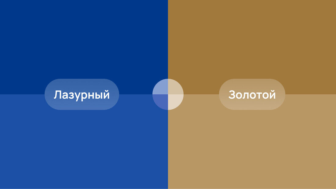 Посмотрели на деле 17 синих и 8 золотых оттенков. Начинаем подставлять в макеты и в головах: «Это не то». Через итераций 5 все-таки пришли к финальной палитре оттенков.