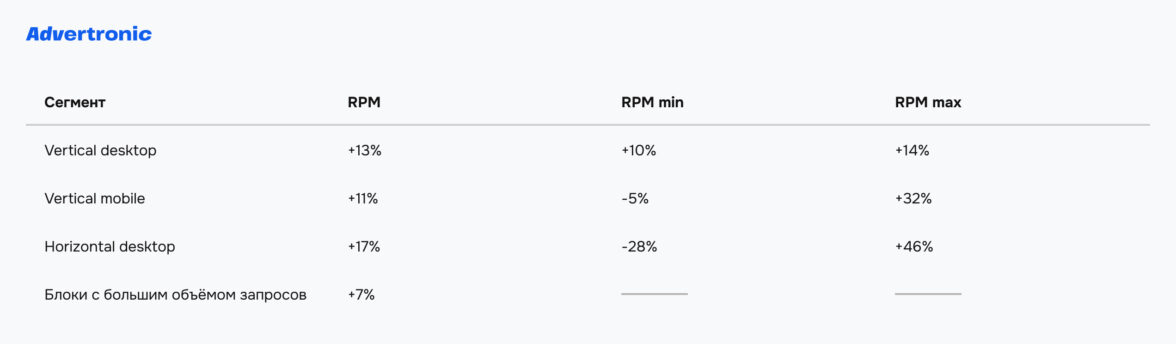 С Advertronic сайты зарабывают больше, а паблишеры экономят время и ресурсы. Чтобы узнать подробности сотрудничества, оставляйте заявку на сайте.