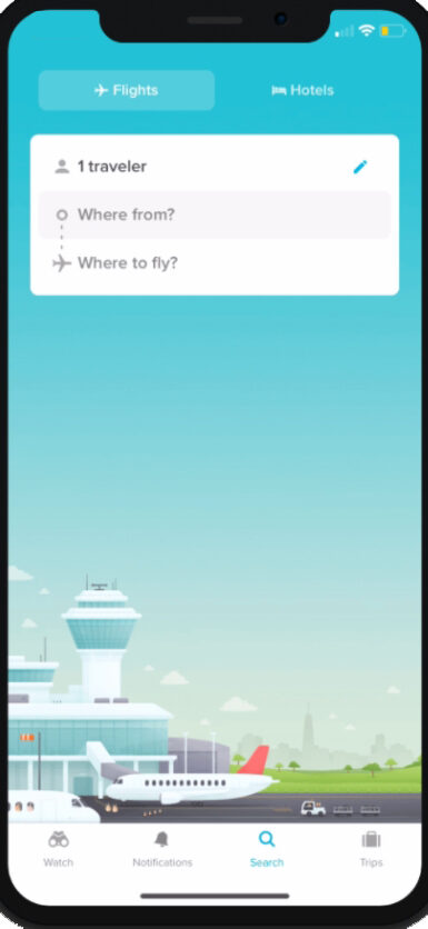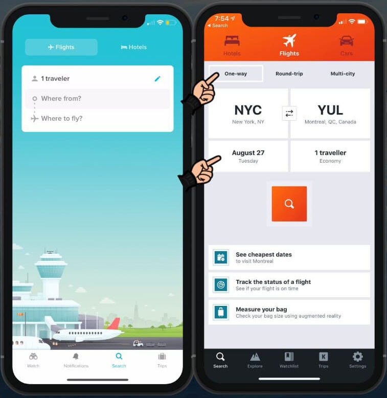 В этом примере приятный фон с аэропортом в приложении для поиска билетов должен стимулировать мечты о следующей поездке и настраивать на позитивный опыт использования приложения. Вариант справа выглядит более запутанным, пользователю нужно подумать о заполнении дополнительных полей: