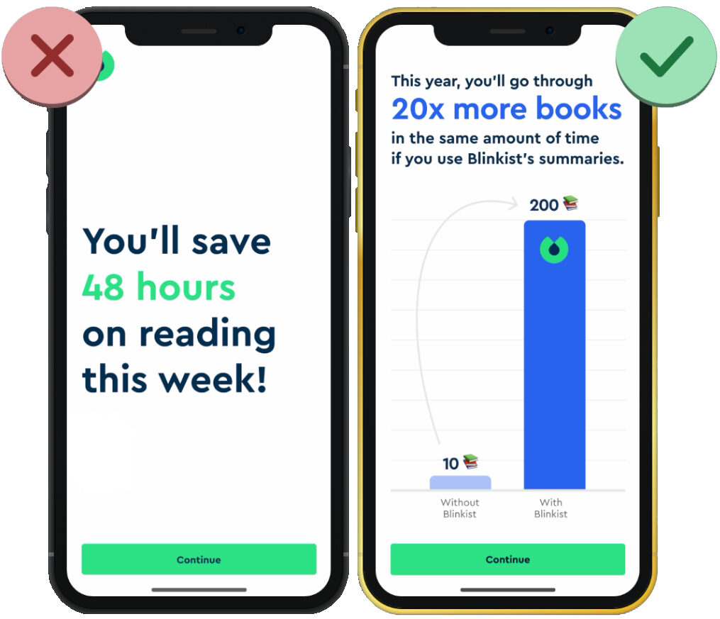 В этом примере противопоставление может наглядно показать основное преимущество приложения и его ценность: оно экономит время. Причем экономия выглядит гораздо значительнее в сравнении на графике.