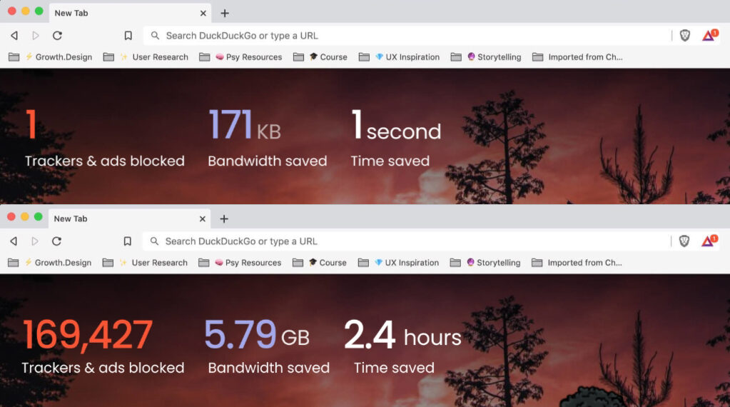 Другой пример: браузер Brave показывает, сколько рекламы заблокировал для пользователя и что еще полезного для него сделал. Счетчик обновляется во время работы пользователя, наглядно видна ценность продукта.