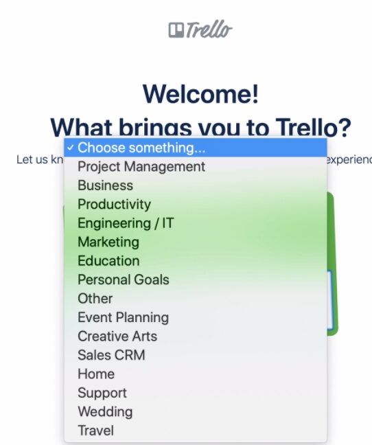 Это касается не только каталогов, но и пунктов в выпадающих списках. Раньше при регистрации в Trello нужно было отнести себя к одному из 15 предложенных сегментов: