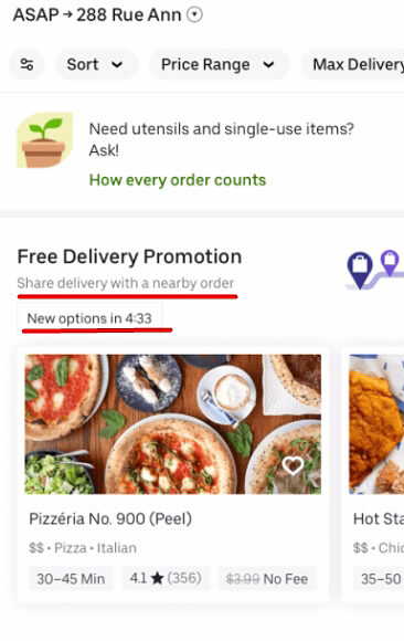 Но дефицит также можно использовать по-другому. К примеру, приложение Uber Eats предлагает разделить стоимость доставки с другими людьми, если вы успеете заказать быстро. Это стимулирует заказывать повторно в известных пользователю местах и быстрее определяться с выбором.