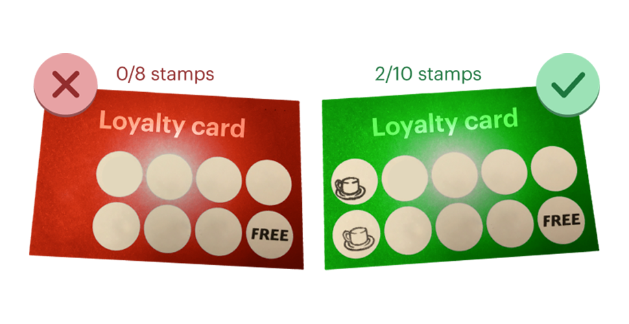 Приблизить пользователя к ощущению близкого завершения задачи можно даже искусственно. К примеру, по одной карточке нужно купить семь кружек кофе, чтобы получить восьмую бесплатно. По другой карточке нужно купить девять кружек, бонусом будет десятая, но на этой карточке две кружки уже отмечены. На обеих карточках одинаковое количество пустых слотов, но на второй он как будто уже начал зарабатывать бонус и потратился на эти две чашки.