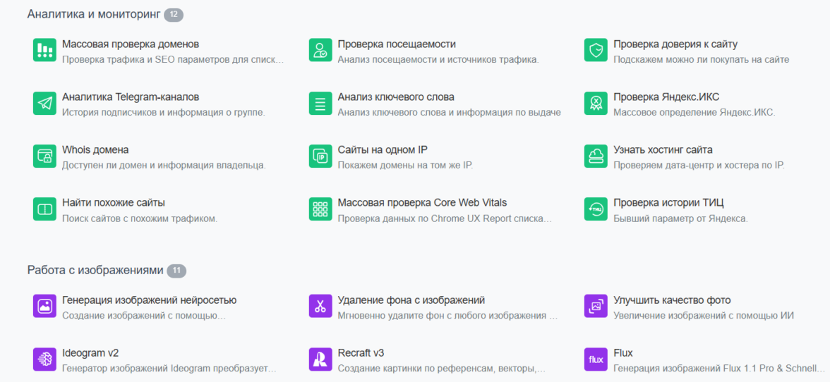 На нашем сайте PR-CY множество онлайн-инструментов для оптимизаторов и владельцев сайтов, но они распределены по тематикам — назначению использования.