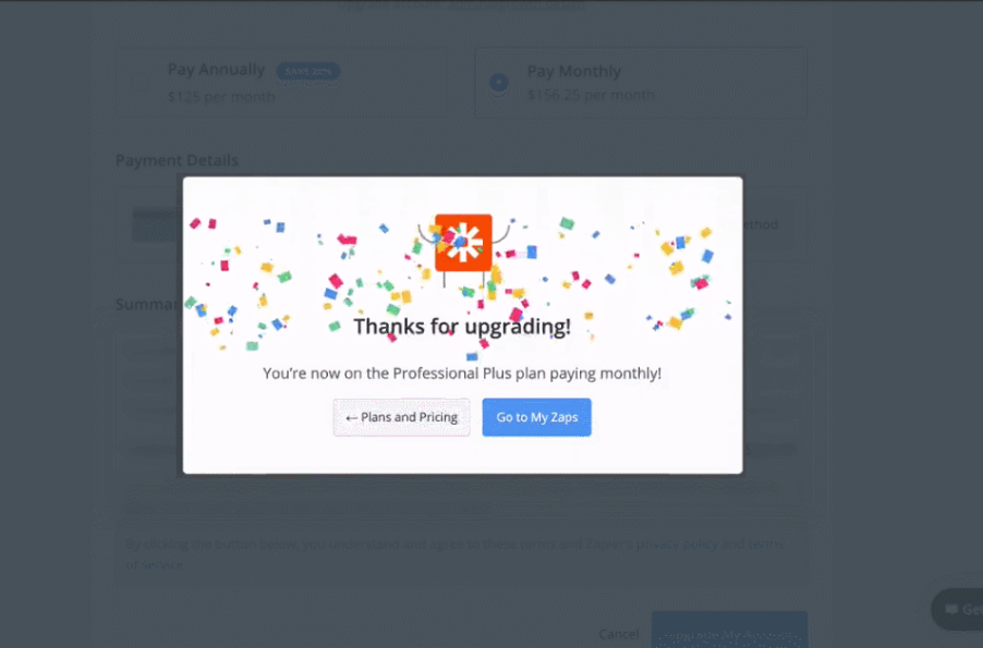После того, как вы заплатите за обновление своей учетной записи, Zapier показывает анимированные конфетти как способ отпраздновать и отвлечь вас от того, что вы отдали им свои деньги. Зато вы получили классный продукт!