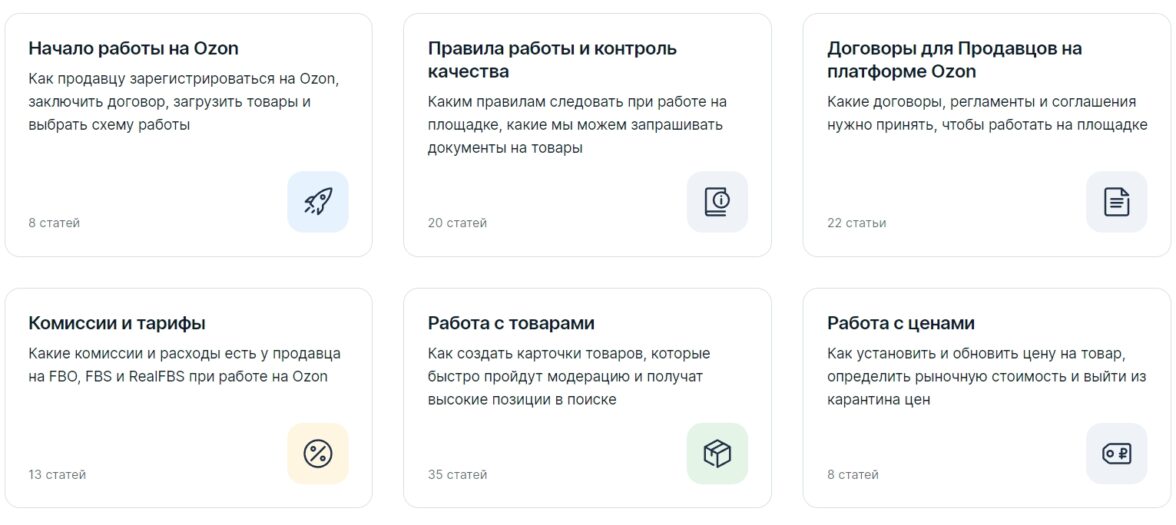 Группировка материалов по тематическим блокам в справочном центре Ozon