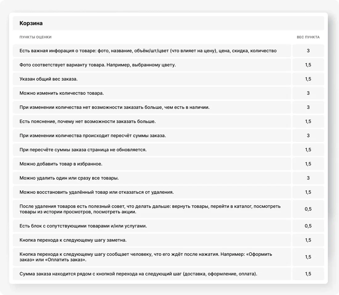 Каждому пункту присвоен вес в зависимости от его критичности для процесса покупки: 0.5, 1.5 и 3. Чем больше баллов набрал интернет-магазин, тем выше он в рейтинге.