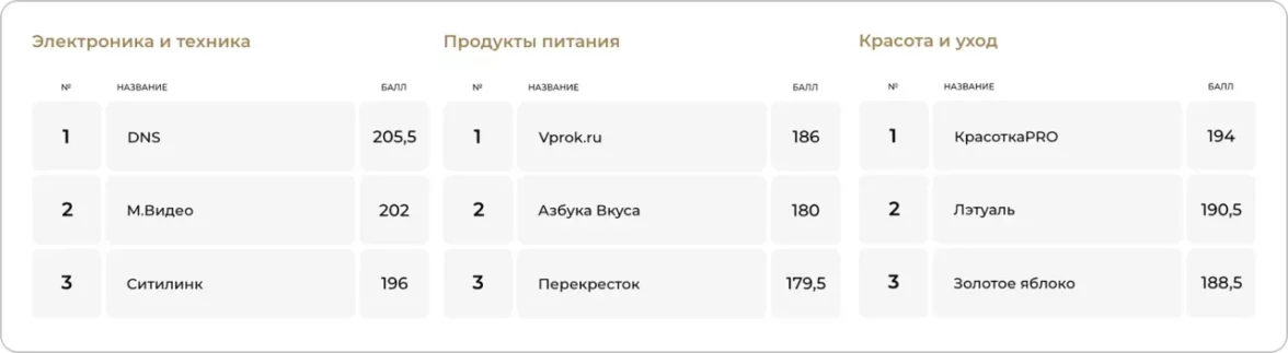 Рейтинг разделён на категории, чтобы не сравнивать магазины стройтоваров с интернет-аптеками. В данный момент опубликованы рейтинги интернет-магазинов в категориях «Электроника и техника», «Красота и уход» и «Продукты питания».