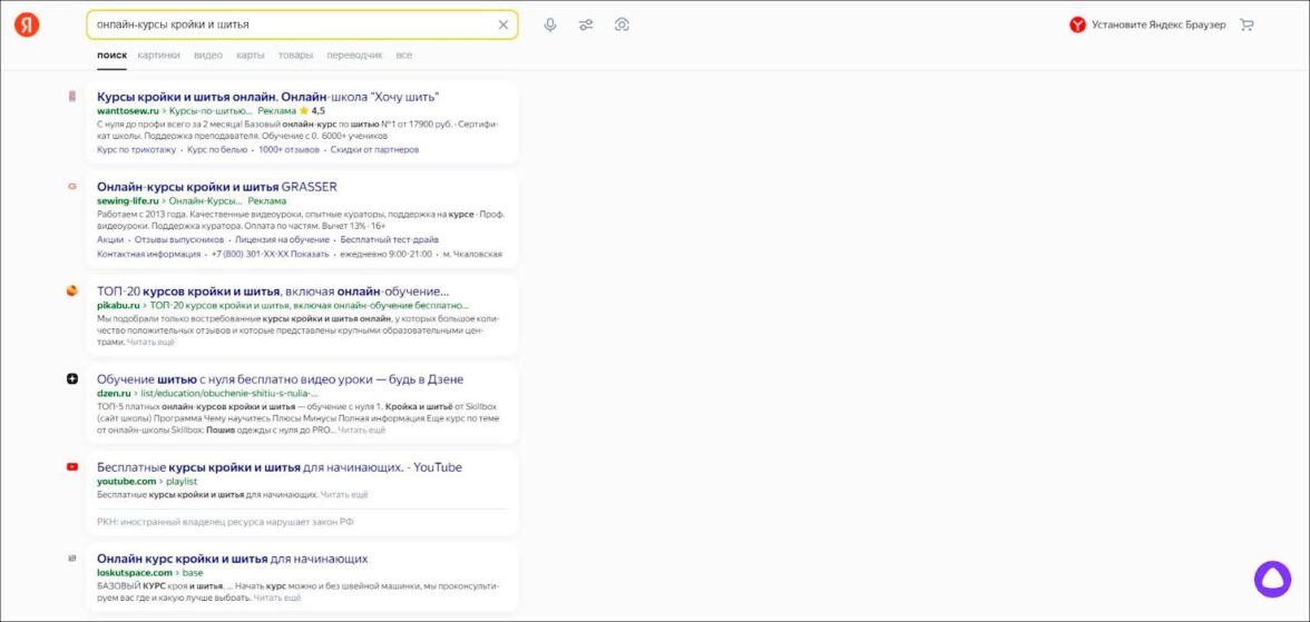 Вот, например, выдача в Яндексе по запросу «онлайн-курсы кройки и шитья»