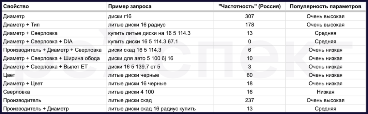 Поэтому мы выделили список свойств для фильтров по параметрам и для фильтров по автомобилям. Здесь есть два столбика, на которые можно обратить внимание: частотность и популярность параметров. Под популярностью параметров мы имеем в виду, что, если мы будем подставлять туда другие диаметры, то они также будут иметь спрос. Это полезные страницы.