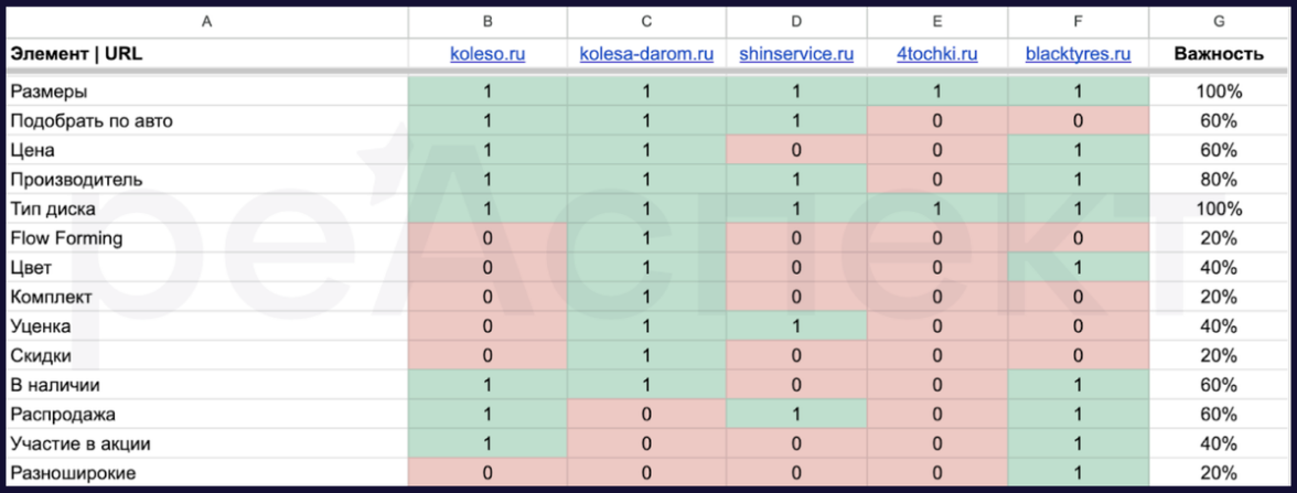 Второй способ — взять список конкурентов, пройтись по значениям и параметрам фильтра, выделить их в таблицу и сравнить с теми, которые есть у нас. Это позволит нам найти новые идеи в плане и улучшить фильтры, чтобы помочь пользователю проще выбирать диски.