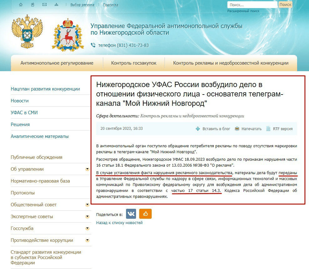 P.S. Как сообщила админ Мой Нижний Новгород, они надеются, что пройдут по штрафу в 2500 рублей по КОАП 14.3 часть 1 (что вряд ли — есть еще часть 15,16), так как телеграм-канал официально оформлен на гражданское лицо. Это по линии ФАС, а от Роскомнадзора еще ничего в отношении паблика не поступало, так как еще нет решения суда по делу, которое возбудило ФАС.