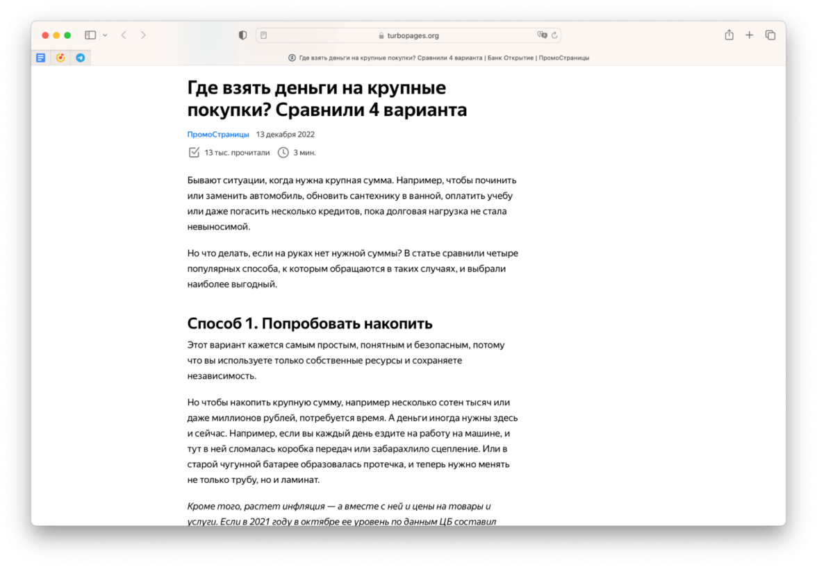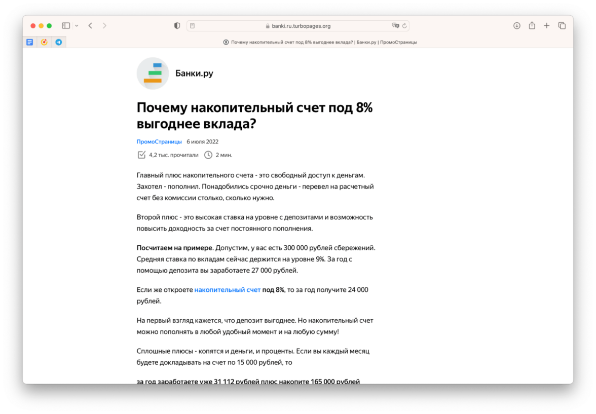 Заголовок может быть рекламным. Для запуска кампании в ПромоСтраницах мы пишем 3–5 разных статей, чтобы проверить, как работают разные заходы. И практически всегда один из заходов — это прямо в заголовке обозначить, что писать будем про такой-то продукт. Например, «Сколько денег вы сможете сэкономить и заработать, если заведёте дебетовую карту от Альфа-Банка»