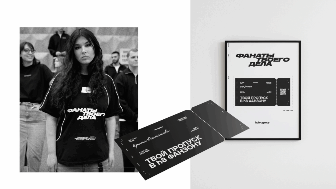 Дальше нужно было подумать, как рассказать о новом Hate сотрудникам, клиентам и рынку. Ведь, по сути, это три целевых сегмента аудитории, на которых мы работаем. Как только оформился новый Hate, в голове рабочей группы сразу же рождались идеи, как мы расскажем об этом: стадион полный болельщиков или офлайн‑презентация для клиентов. Нам хотелось, чтобы это был не просто пресс‑релиз в СМИ, а какие‑то события, во‑первых, отражающие наше позиционирование и, во‑вторых, доступные в реализации. Поэтому от стадиона с болельщиками мы отказались сразу, но поддержать фанатский лайн нам хотелось, так появились одни из основных атрибутов обновления — фирменная джерси и билеты в фан‑зону на просмотр нового манифеста Hate Agency.