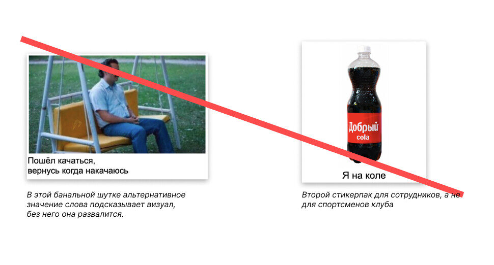Возможно, некоторые из вас возразят, что читатель может изначально принять слово ролл за еду — тогда ожидание не будет разрушено и шутка провалится. Действительно, так может быть, но здесь на нас работает контекст: эти стикеры будут дарить спортсменам, которые несколько раз в неделю занимаются фитнесом. А значит, их сознание, определённое бытием (спорт, фитнес, скакалка, гантель, ролл и так далее), с большей вероятностью считает значение, удобное нам. С суши-мастером эта шутка бы не сработала. Или сработала, но её нужно переделать наоборот — предложите свой вариант в комментариях.