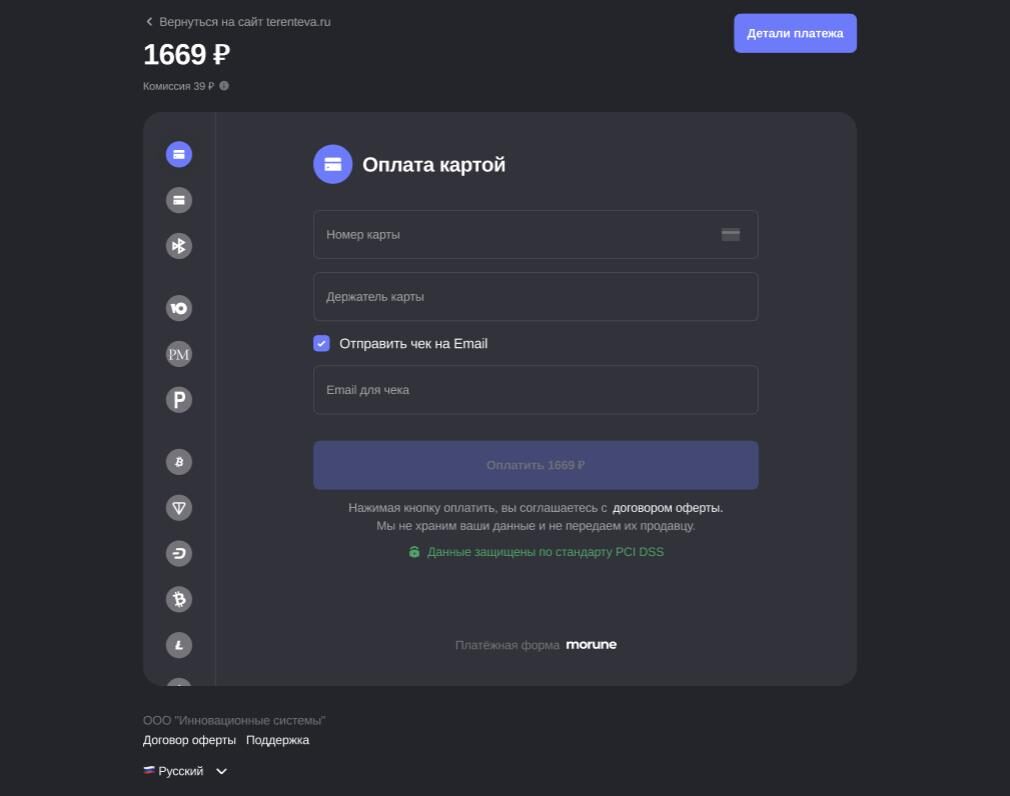 А еще, удобство Morune заключается в простоте интерфейса и быстрой обработке платежей. Сервис поддерживает различные способы оплаты, что делает его универсальным инструментом для проведения финансовых операций.