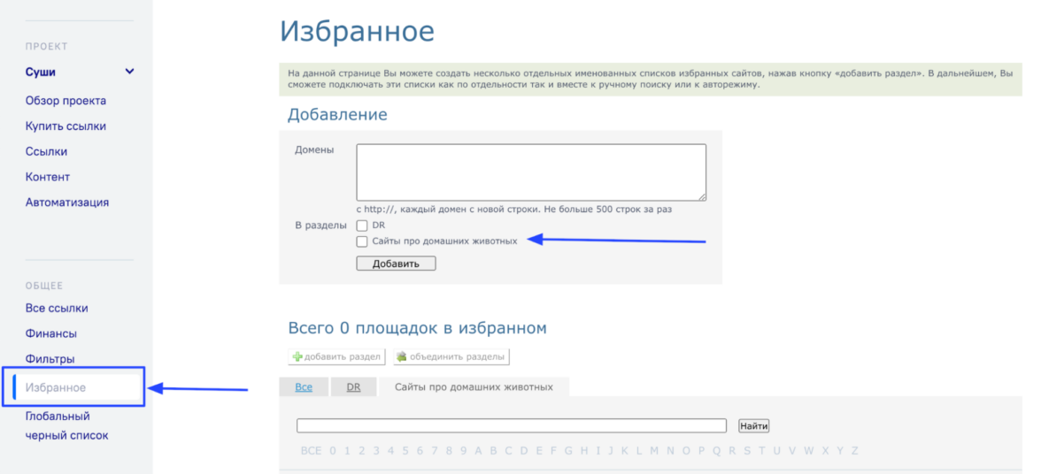 2. В личном кабинете LinksSape укажите адреса этих площадок в разделе «Избранное». Далее нажмите «Добавить».