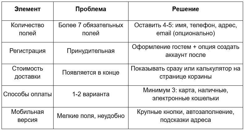 Каждое дополнительное поле в форме снижает конверсию на 3–5%. Оставьте только необходимый минимум: имя, телефон, адрес доставки. Предложите оформление без регистрации — многие покупатели не хотят создавать аккаунт для разовой покупки. Если регистрация критична для вашей бизнес-модели, предложите её после оформления заказа, а не до.