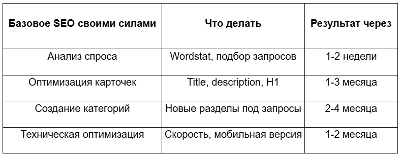 Параллельно сделайте базовую SEO-оптимизацию своими силами: проанализируйте спрос через Wordstat, оптимизируйте заголовки карточек товаров, создайте недостающие категории под популярные запросы. Запустите контекстную рекламу в Яндекс.Директе на небольшом бюджете (5000–10000 рублей) для получения первых продаж и обратной связи от реальных покупателей.