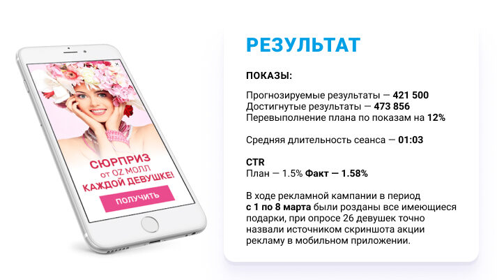 Мы превзошли план по показам на 12% и достигли CTR в 1.58%. Более того, с 1 по 8 марта все подарки были распроданы. При этом 26 девушек уточнили, что мобильная реклама была главным источником информации об акции.