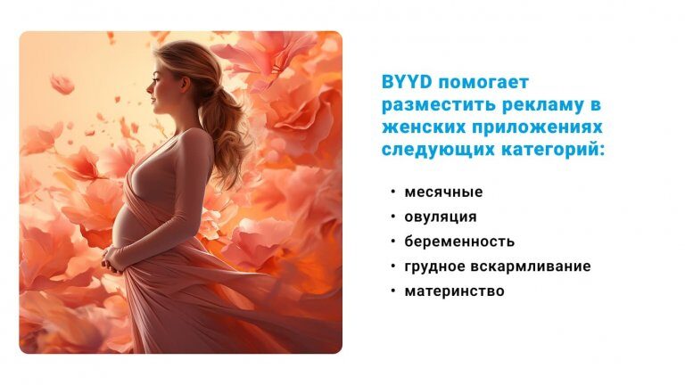 Также рекомендуем ознакомиться с нашей статьей и видео материалом о рекламе в женских приложениях через мобильную платформу BYYD. В них мы подробно разбираем, как программатик реклама помогает брендам продвигать свои продукты и услуги в приложениях, ориентированных на женскую аудиторию.