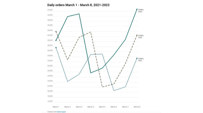 Действительно, анализ данных за последние 3 года подтверждает: 8 марта является одним из наиболее активных дней по заказам. Подобный всплеск заказов говорит о том, что люди приобретают подарки не только для других, но и для себя. Это важно учитывать при запуске рекламы, так как выбор таргетинга и креативов зависит от целевой аудитории.