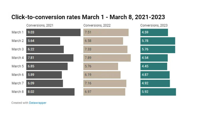 Дополнительно, при подготовке электронной рассылки необходимо учитывать коэффициент конверсии по клику. Из статистики видно, что в разные годы наилучшие результаты достигались в разные дни перед праздником: в 2021 году — 1 марта, в 2022 году — 4 марта, а в 2023 году — 8 марта.