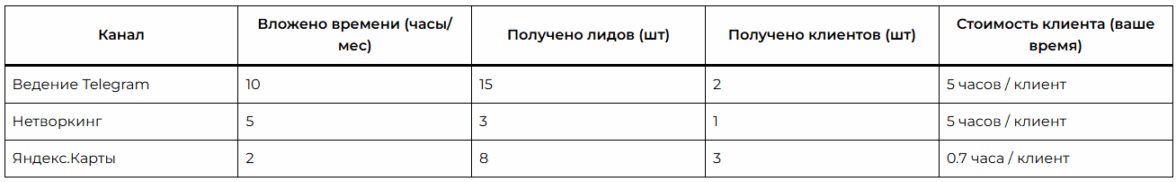 Такая простая таблица наглядно покажет вам, какой канал приносит максимум результата при минимуме затрат времени.
