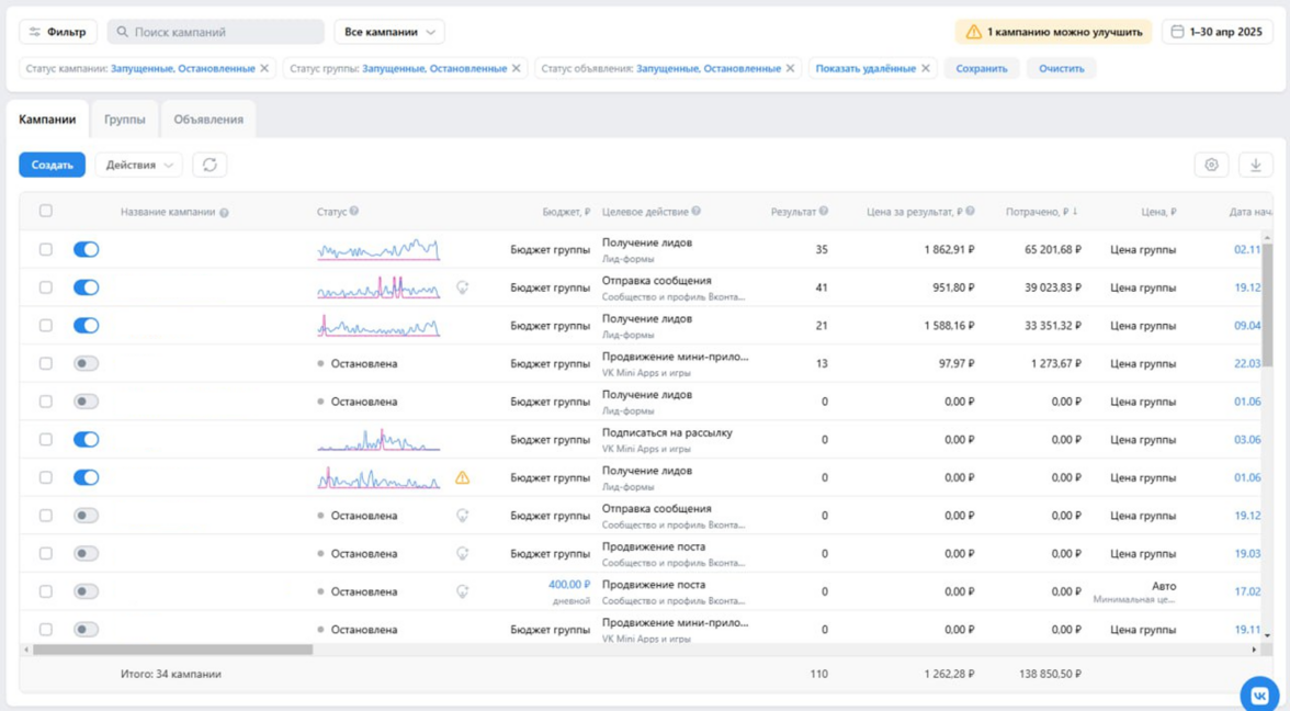 Скриншот из рекламного кабинета проекта за апрель 2025 г.