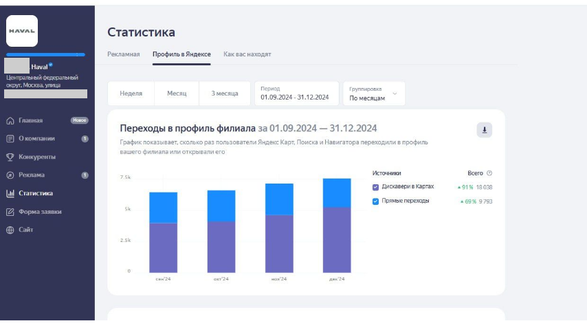 Выделить профиль салона HAVAL на картах с использованием логотипа и уникального фирменного оформления. А также сделать видимой метку с логотипом без поискового запроса.