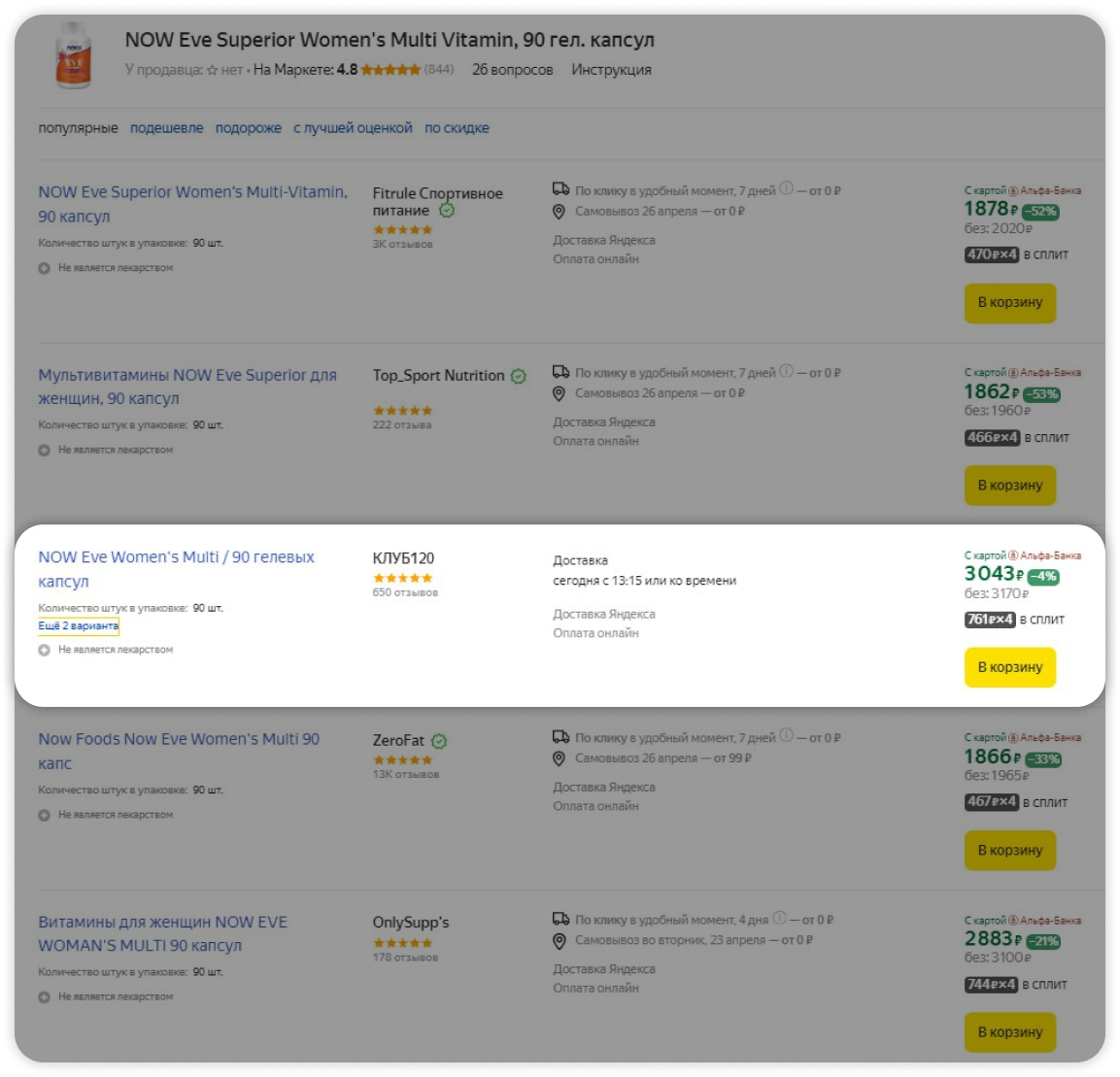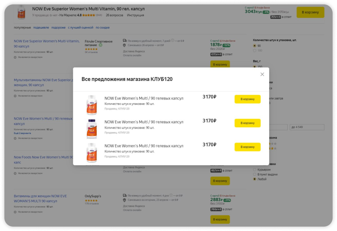 Пользователь видит, что товар от CLUB120 можно заказать только с доставкой от Маркета