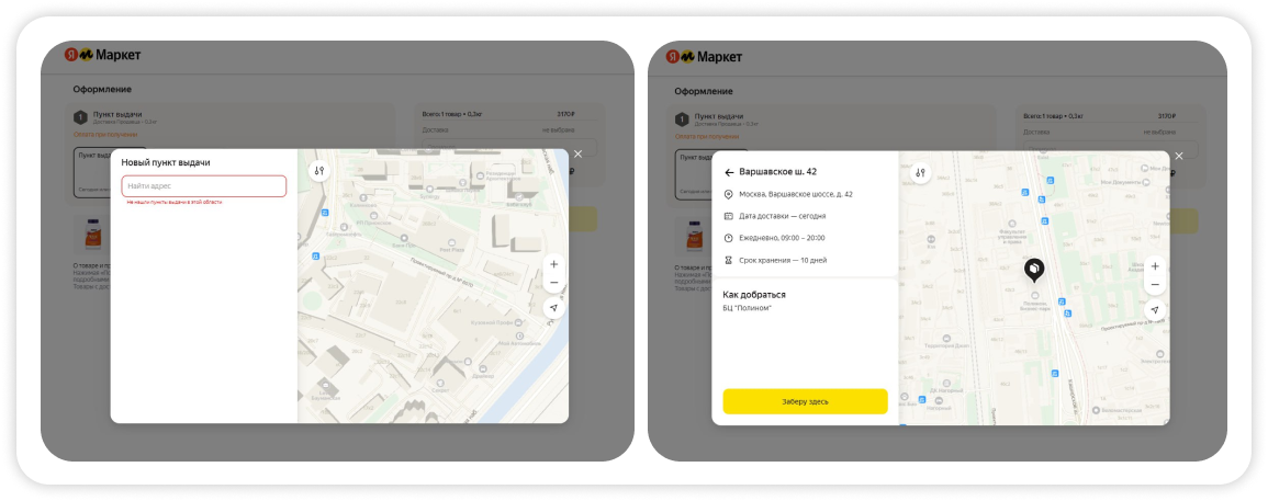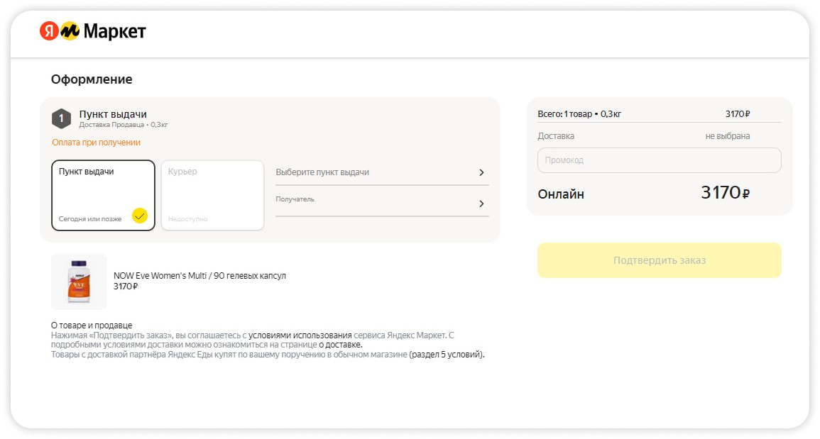 На скрине видно, что продавец предлагает несколько вариантов доставки: курьером Маркета или самовывозом. Но кликабельный — только первый. Если же покупатель хотел заказать с доставкой от Маркета, он должен возвращаться на предыдущую страницу и добавлять в корзину другой товар.